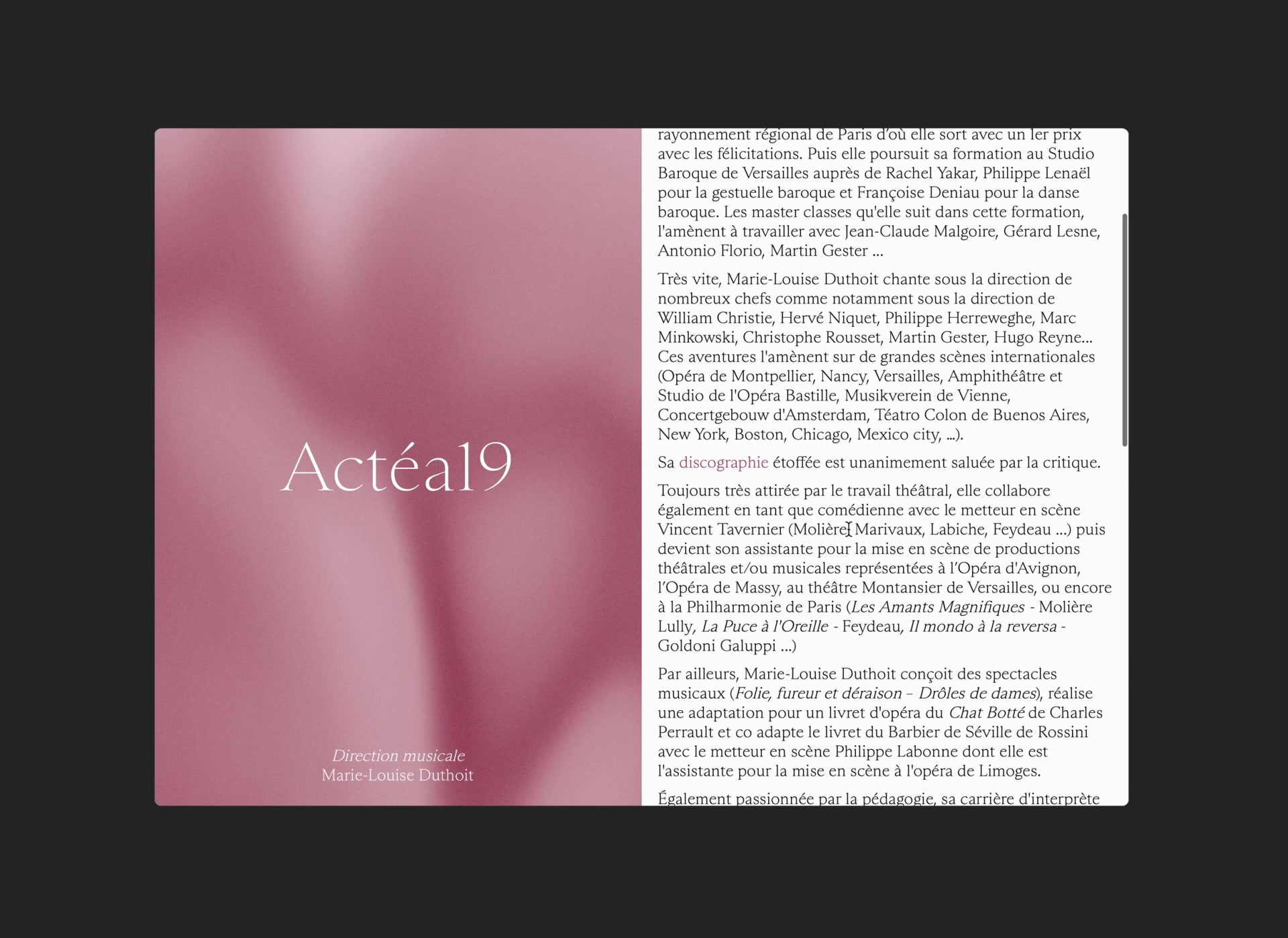 Actéa19 est un ensemble de musique ancienne créé à Toulon en 2019 par Marie-Louise Duthoit. L’ensemble mène à la fois une activité de concerts, de recherche musicologique autour des compositeurs régionaux et de médiation.